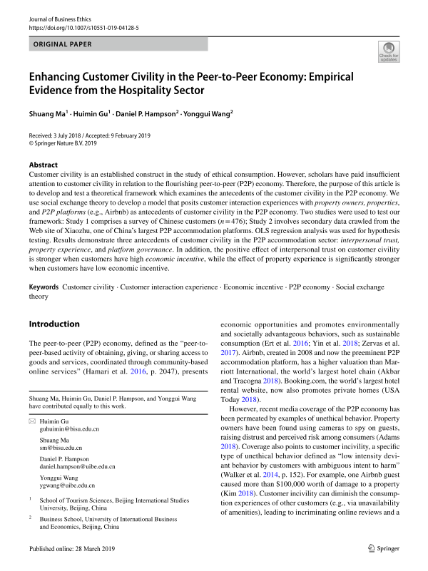 Ma Shuang, Gu huimin, Daniel Hampson, Wang Yonggui, (2020). Enhancing customer civility in the peer-to-peer economy: empirical evidence from the hospitality sector. Journal of Business Ethics (金融时报认定的FT50, A-), 167(1): 77-95.
