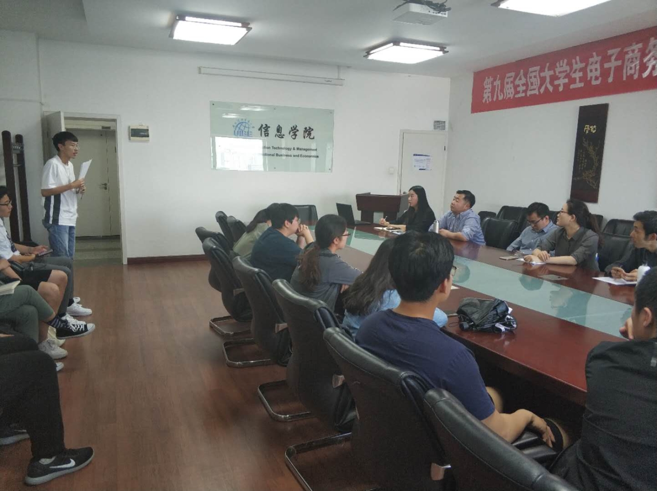 5月9日黄色电影 2018-2019学年第二学期学生座谈会在博学楼1416会议室召开。会议由本科教学副院长倪耀东主持,电商系主任程絮森老师、信管系主任于晓丹老师、大数据系主任黄浩老师、教学秘书郭程老师以及22名学生代表参加了此次座谈会。