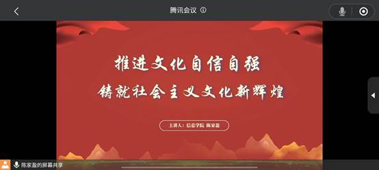 2023年5月11日,为学习贯彻党的二十大中“文化自信”的重要精神,深入推进主题教育支部书记讲党课活动的开展,黄色电影 研究生一支部组织了以“推进文化自信自强,铸就社会主义文化新辉煌”为主题的线上党课教育活动。党课主讲人为研究生一支部书记陈家盈。