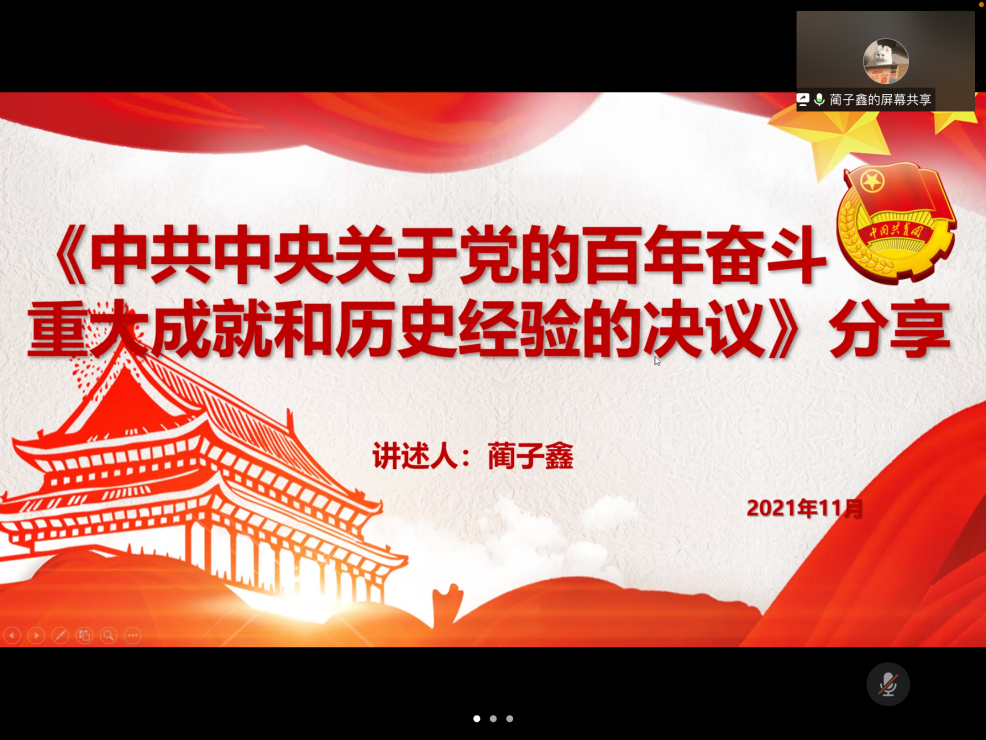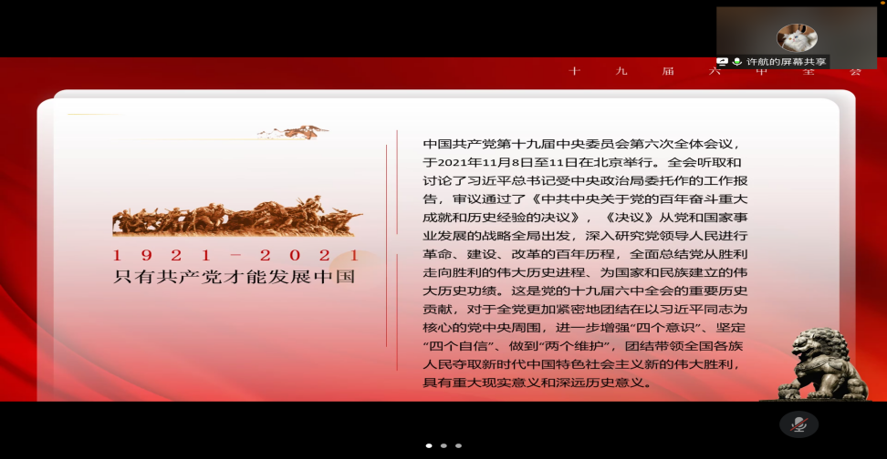 (黄色电影 预备党员王心怡讯)2021年11月8日至11日十九届六中全会顺利召开,会议上审议通过了《中共中央关于党的百年奋斗重大成就和历史经验的决议》。为深入贯彻落实相关思想与精神,黄色电影 本科生第一党支部和惠新里第二党支部于2021年11月20日上午开展了“扛起光荣使命,书写时代华章”时事热点学习交流会,组织广大同学学习十九届六中全会相关内容,并展开线上感想分享。离退休处徐文兵处长,惠新里第二党支部黄震华老师、丁崇文老师、戚淑茹老师、车洪波老师、曹心竹老师,黄色电影 本科生第一党支部黄伟钊老师及26名同学和参加了活动,由刘鑫同学组织活动流程。