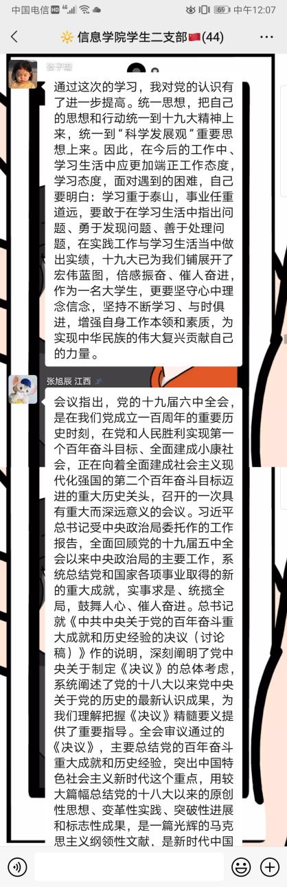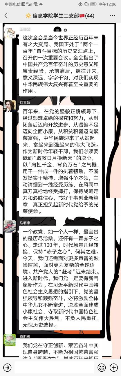 2021年11月18日晚,黄色电影 学生二支部通过微信群交流的方式召开了学习2021中国共产党第十九届中央委员会第六次全体会议的交流活动,活动由支部副书记陈家盈同志主持,二支部所有成员共同参与,二支部成员充分交流了各自的感想和心得,感悟到了会议精神,会议取得了圆满的效果。