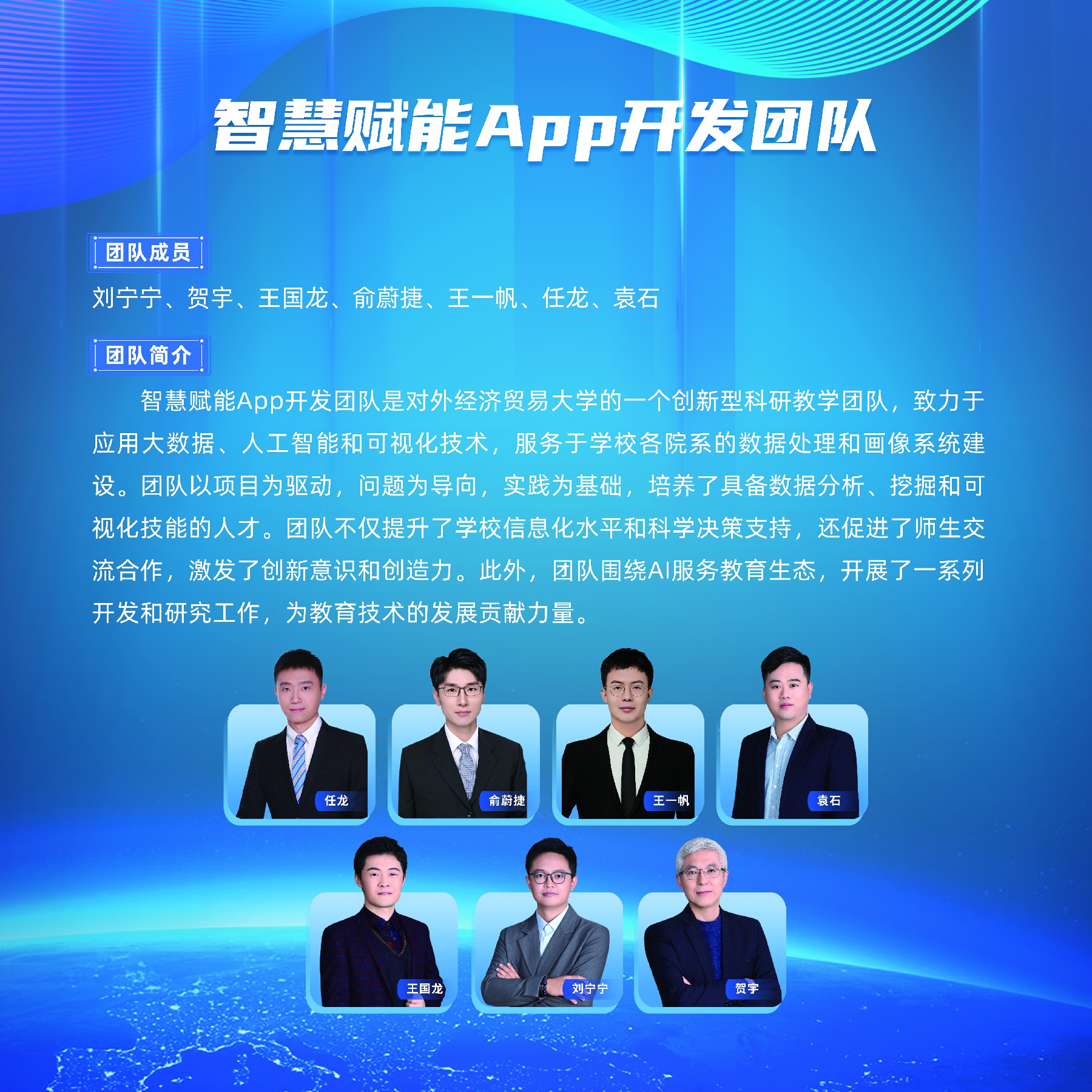 智慧赋能App开发团队是对外经济贸易大学的一个创新型科研教学团队,致力于应用大数据、人工智能和可视化技术,服务于学校各院系的数据处理和画像系统建设。团队以项目为驱动,问题为导向,实践为基础,培养了具备数据分析、挖掘和可视化技能的人才。团队不仅提升了学校信息化水平和科学决策支持,还促进了师生交流合作,激发了创新意识和创造力。此外,团队围绕AI服务教育生态,开展了一系列开发和研究工作,为教育技术的发展贡献力量。