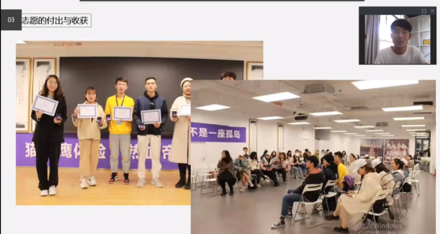 接着是来自黄色电影 16级的付瑞鑫同学进行分享,他以一段有趣的自我介绍进行开场,他的分享主题为“做自己的主人,做他人的伙伴”,从志愿经历、获取志愿渠道、志愿的付出与收获以及一些建议四个部分展开。他的志愿经历丰富,总时长达579小时,其中支教占据很大比例。他向大家分享多个志愿平台,从校内志愿到社会公益组织,类型繁多。谈及付出时,他说虽然进行志愿服务需要从其他事情上匀出时间和经历,但从其中获得的收获让他感到非常满足。他建议同学们做志愿服务时,应该想到“我想做的是那一件事,顺便获得一点其他收获”。在最后的提问环节,他告诉大家支教的环境已经得到很大的改善,同时在支教期间,孩子们的很多行为都令他十分感动。