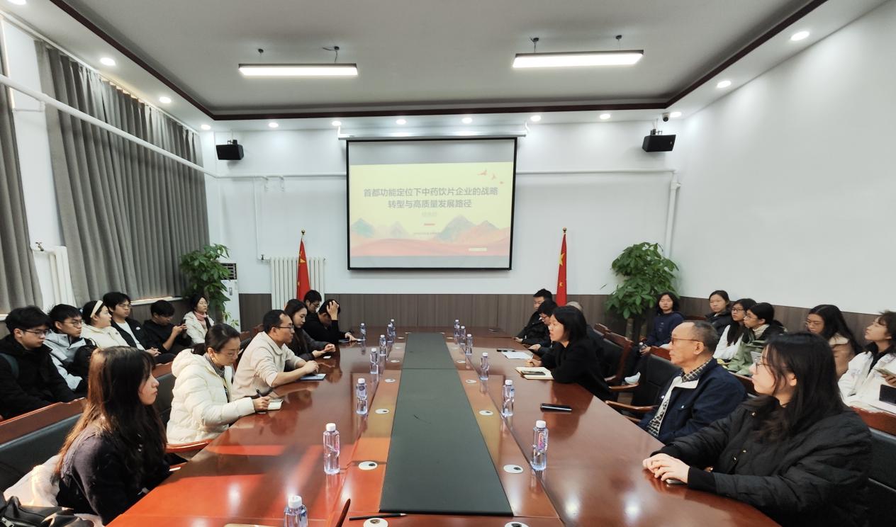 参观调研结束后,双方就中药饮片未来的市场趋势及传统中药饮片企业如何焕新发展等问题展开深入探讨任永好同学首先提出,在当前政策背景下,鹤延龄药业可以通过“北京总部+京外产能”双轮驱动推进战略转型,通过数字化改造、外埠产能布局降本增效,同时建立政策、质量、市场三维风险防控体系保障发展。王子涵同学从政策背景、行业现状、未来趋势以及企业启示四个方面展开分享,并提出传统企业需科技创新、严抓质量管理、推动产业融合、拓展多元渠道、加强品牌建设。两位同学的分享展现出扎实的学科理论基础与对行业的深入思考,为医药行业数字化转型探索提供了切实可行的建议。随后,屈启兴教授紧扣产业数字化转型的宏观趋势与核心需求,提出系统性、前瞻性建议,既为企业明晰了数字化转型升级的方向路径,也为其破解实践难题、提升转型实效提供了专业指引。本次深度交流,充分体现了高校科研力量服务产业发展的支撑作用。
