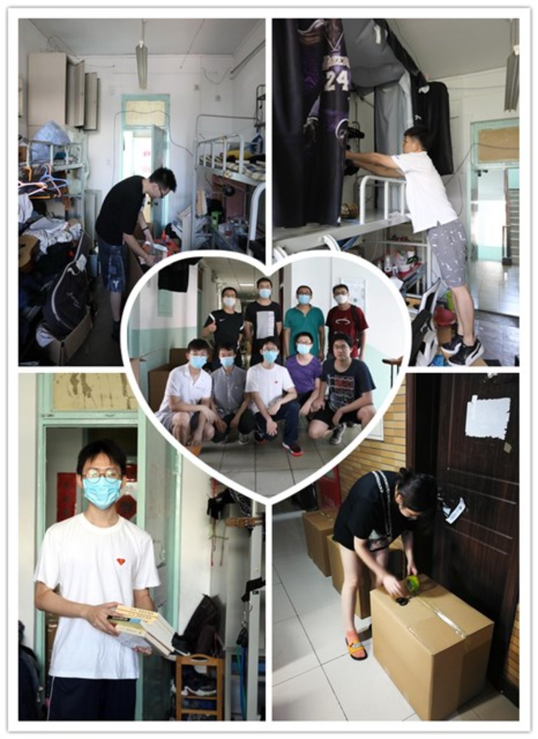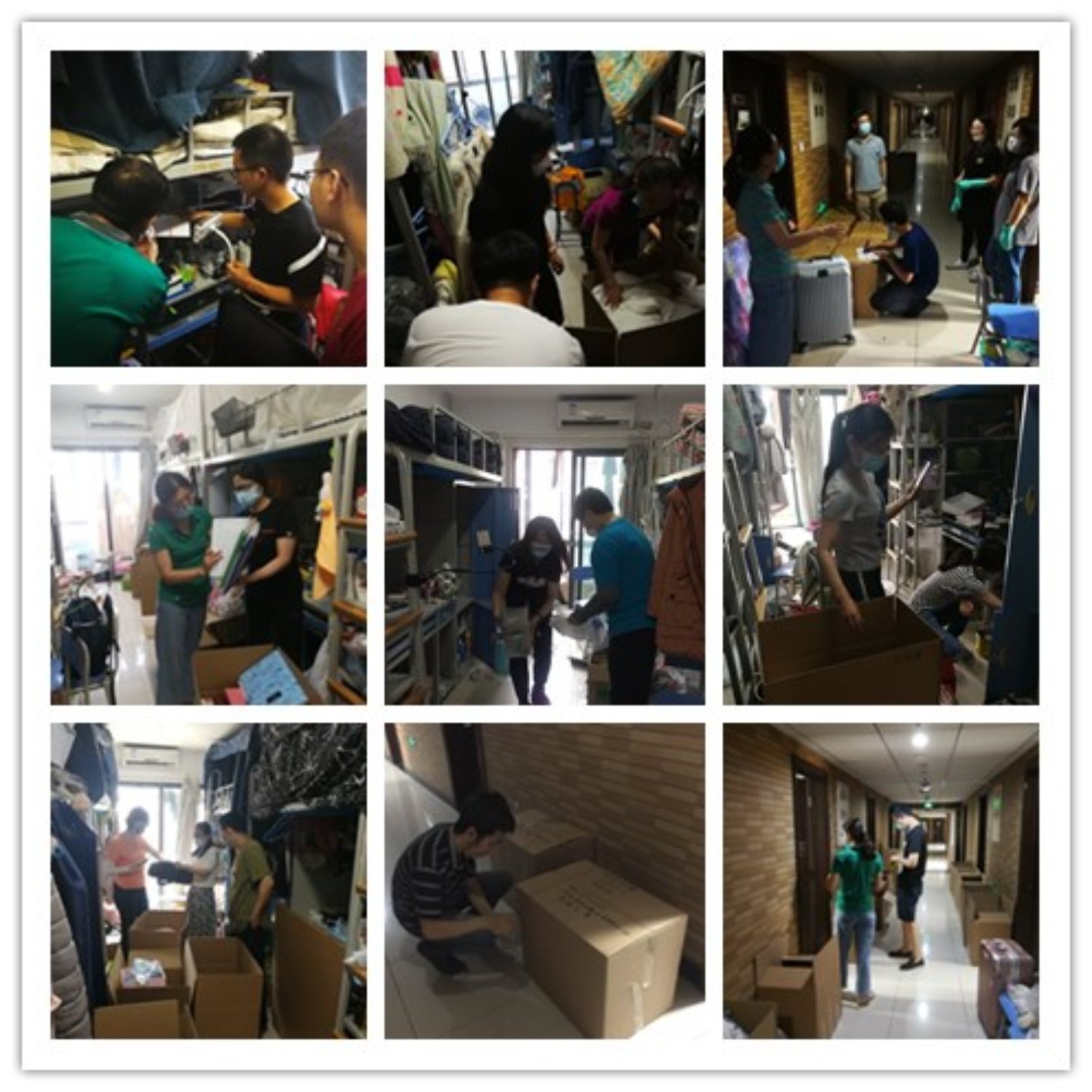 办公室主任刘建军老师带领几位行政老师组成后勤保障组,在打包前为老师和同学们购买防疫物资和打包物资,在打包工作进行的几天中,他们往来于食堂与宿舍楼之间,穿梭于每个宿舍,准时为打包行李的师生送去盒饭和清凉解暑的西瓜和水。打包行李组的老师们利用腾讯会议与学生视频连线,实时联系沟通,爬高俯身,为学生翻找每一件物品,谨慎处理每一件贵重物品和易碎物品,耐心询问每一件物品的去留,精心打包各类物品。为节省行李打包的时间,老师和同学们都是在学生宿舍简单吃一份盒饭,就继续开展打包工作。