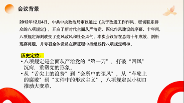 活动最后,党支部将以此次党课为新的起点,希望全体党员同志把八项规定精神转化为“为民服务的行动指南,干事创业的作风标尺”,在新时代新征程中争当作风建设排头兵。