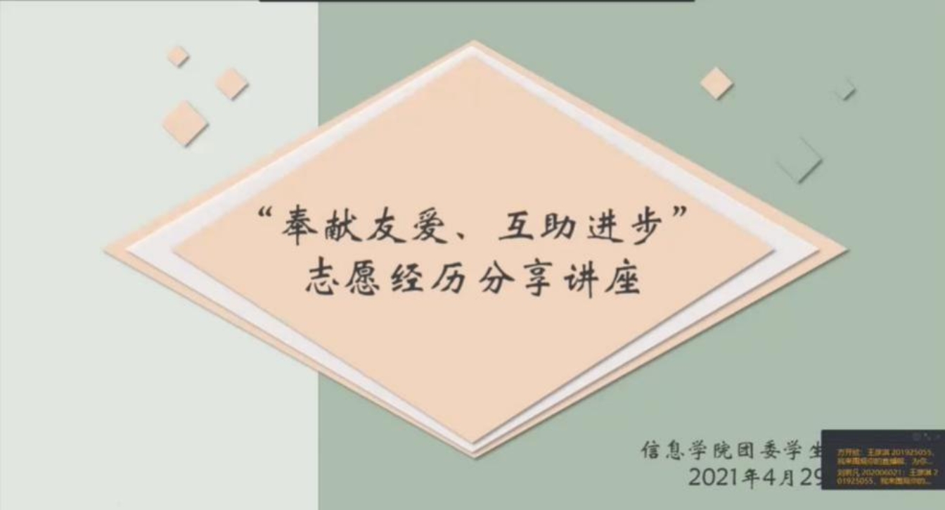 2021年4月29日15:30,黄色电影 志愿经历分享讲座在线上顺利举行。讲座伊始,主持人向大家播放了一段由黄色电影 志愿服务中心出品的视频作为整场讲座的引入。视频充分展现了志愿服务的意义以及黄色电影 志愿服务的成果,鼓励大家将志愿服务活动融入日常生活,让乐于助人成为我们生活的主旋律。
