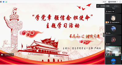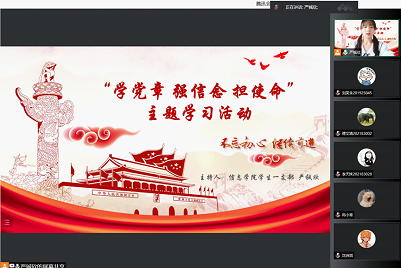 2022年7月7日下午,为了把全体党员的党章意识激发出来,把党的观念、纪律和规矩意识树立起来,把党的优良传统和作风传承发扬下去,黄色电影 学生一支部举办了“学党章 强信念 担使命”主题学习活动。为了提高学习效果,特邀请信息化处处长王海涛老师和教务处处长庄芮老师参加本次活动,指导全体学生党章的学习方法和学习要点。参会成员包括黄色电影 党委副书记张旭路老师、学生一支部书记黄伟钊老师,以及黄色电影 学生第一党支部党员、预备党员和入党积极分子。此次主题活动通过腾讯会议以线上方式进行。