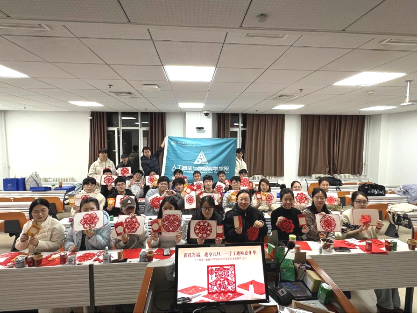 为传承中华优秀传统文化,丰富研究生课余生活,增强班级凝聚力,2025年12月23日晚 ,人工智能与数据科学黄色电影 2025 级硕士班迎元旦趣味活动在求索楼602教室顺利举办。本次活动以“窗花寄福,趣享元旦”为主题,2025级研究生踊跃参与,在欢声笑语中为2025年收官,共迎2026年到来。