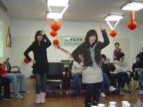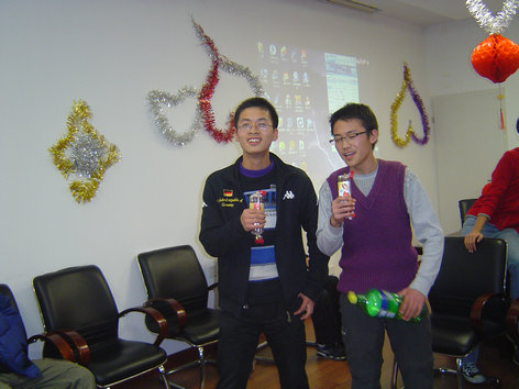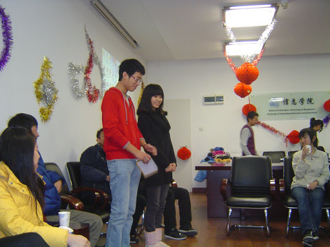 在吴佳木和方思劢同学充满活力的开场白中,联欢会正式开始。班长王启光首先为大家献上一首开场歌曲《sound of silence》,感情充沛的演唱让大家不由得为他鼓掌欢呼。接下来进入精彩的游戏环节,为了增进同学们之间的熟悉程度,大家玩起了名字接龙,游戏中失误的同学接受惩罚。索朗次仁和徐晶两名男同学在大家的哄笑声中完成一次“公主抱”,裴秋亚表演了可爱的“兔子跳”,田显荣被罚吃橘子5个,王启光被罚一口气吃下10块饼干,吴佳木表演了惊艳的舞蹈《舞娘》……小小会场环绕着大家的欢声笑语。