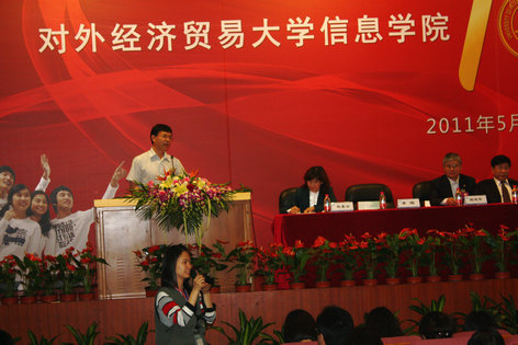 将抓住这一难得的发展机遇:坚持以科学发展为统领,实施内涵发展、特色发展和现代化发展;切实坚持以人为本,实施人才强效战略、国际化发展战略和机制体制创新战略;继续推进科学研究,服务社会,尤其是在现代服务业、电子商务、电子金融、供应链管理、服务贸易和服务外包等方面的研究和社会应用,着力培养出一大批高素质、创新型、具有国际视野的一流人才。 对外经济贸易大学校长施建军教授致辞