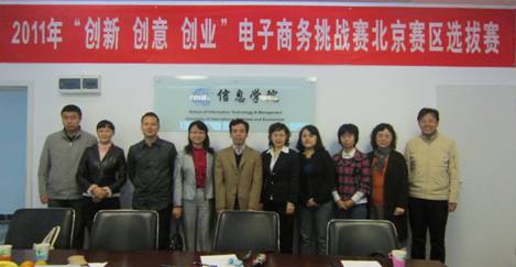 2011年10月22日,竞赛组委会组织召开了第三届全国高校“创新 创意 创业电子商务挑战赛北京分赛区本科组现场答辩评审会。本次现场答辩评审会专家组由对外经济贸易大学赵星秋副教授、对外经济贸易大学王朝培副教授、对外经济贸易大学佟强讲师、北京邮电大学胡桃副教授、北京联合大学田玲副教授、北京林业大学樊坤讲师、中国投资网史大展副总裁、北京博导前程信息技术有限公司段建总裁八位专家组成,竞赛组委会秘书长黄健青担任现场督查。