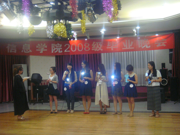 一段双人爵士舞宣告晚会正式开始,而接下来一个传统的游戏抢椅子很好地活跃了场上的气氛。“十佳歌手”王雯的出现掀起了一阵小高潮,而她为大家带来的动感十足的歌曲《套马杆》引爆全场大合唱,气氛high到极点。游戏“我爱记歌词”:每班派出一名代表,在播放完前奏之前进行抢唱,抢唱时还需戴上播放着强烈干扰音乐的耳机唱出正确歌词。说是“记歌词”,但其关键之处却在于一个“抢”字。没麦克风就算你知道是什么歌也只能在那儿眼红干着急。于是,无辜的话筒就被一群疯狂的麦霸肆意蹂躏。因为耳机里音乐干扰,大家唱出来的歌曲也是五花八门。走调是必须的,而什么颤音、吞词也是层出不穷,甚至逼急了也不管什么调子了,直接来段说唱。台上受苦受难的参与者的辛酸没有白费,在座的观众从游戏一开始到结束笑声就没停过。