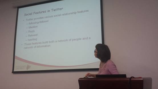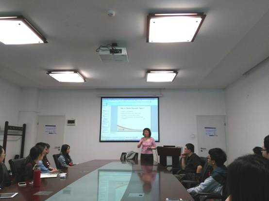 在首先进行的学术讲座中,Jian Yang教授做了题为“Topic Derivation in Twitter”的学术报告,并分享了对这一问题的独特体会,以及介绍了一个在研究中非常实用的Matrix Factorization工具。参与报告的老师和同学们针对这一研究领域和Jian Yang教授进行了热烈的讨论,都感觉受益匪浅。