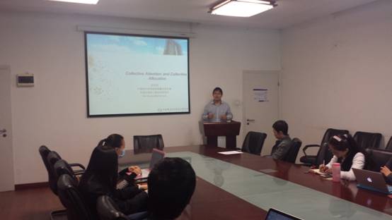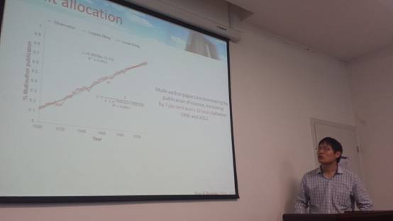 在首先进行的学术讲座中,沈博士做了题为“Collective Attention and Collective Allocation”的学术报告,这项成果发表在2014年的Science期刊上,其核心思想是如何利用社会网络来对科研成果进行贡献分割和学术评价。沈博士讲解的幽默风趣又不失严谨,报告现场反响热烈。参与报告的老师和同学们针对这一研究领域和沈博士进行了热烈的讨论,都感觉受益匪浅。