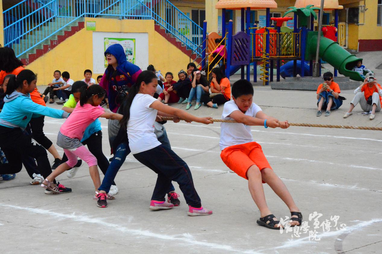经过了两个小时的欢声笑语,志愿者们与小朋友们在食堂共进午餐,稍作休息。下午一点,大家回到操场,开始进行团体项目的角逐。团体项目分为接力跑、蛟龙出海、呼啦圈接力和拔河四个项目。小朋友们以班级为分组,每个人都全力以赴,希望为自己的班级争光。志愿者们在为他们计时的同时,也为他们加油打气,不断地鼓励小朋友不放弃。虽然天气炎热,却没有一个人离开操场去乘凉,每个人都被这欢乐的气氛深深地感染着。最后,志愿者们自己也举办了一场拔河比赛,小朋友们在一旁为自己支持的队伍呐喊助威。