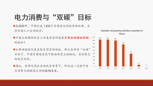 此外,郭琨老师还讨论了在全面脱贫背景下电力消费与碳排放的脱钩关系,她指出,定量研究结果表明,贫困县比非贫困县更有可能实现用电与二氧化碳排放的脱钩,中国在消除贫困的同时并未放松对贫困县的碳排放约束。