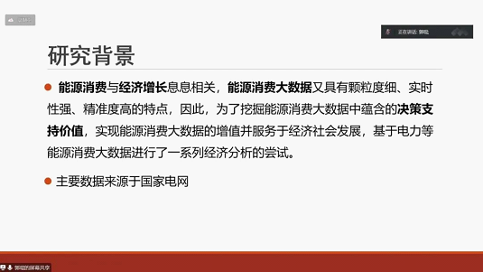 首先,郭琨老师向师生们介绍了此次讲座的研究背景。能源消费与经济增长、人民生活水平息息相关,能源消费大数据又具有颗粒度细、实时性强、精准度高的特点。能源领域是数字经济研究的天然沃土,挖掘出能源消费大数据中的决策支持价值,不仅可以为企业本身的科学决策赋能,同时也将为经济社会分析提供重要的基础资料。