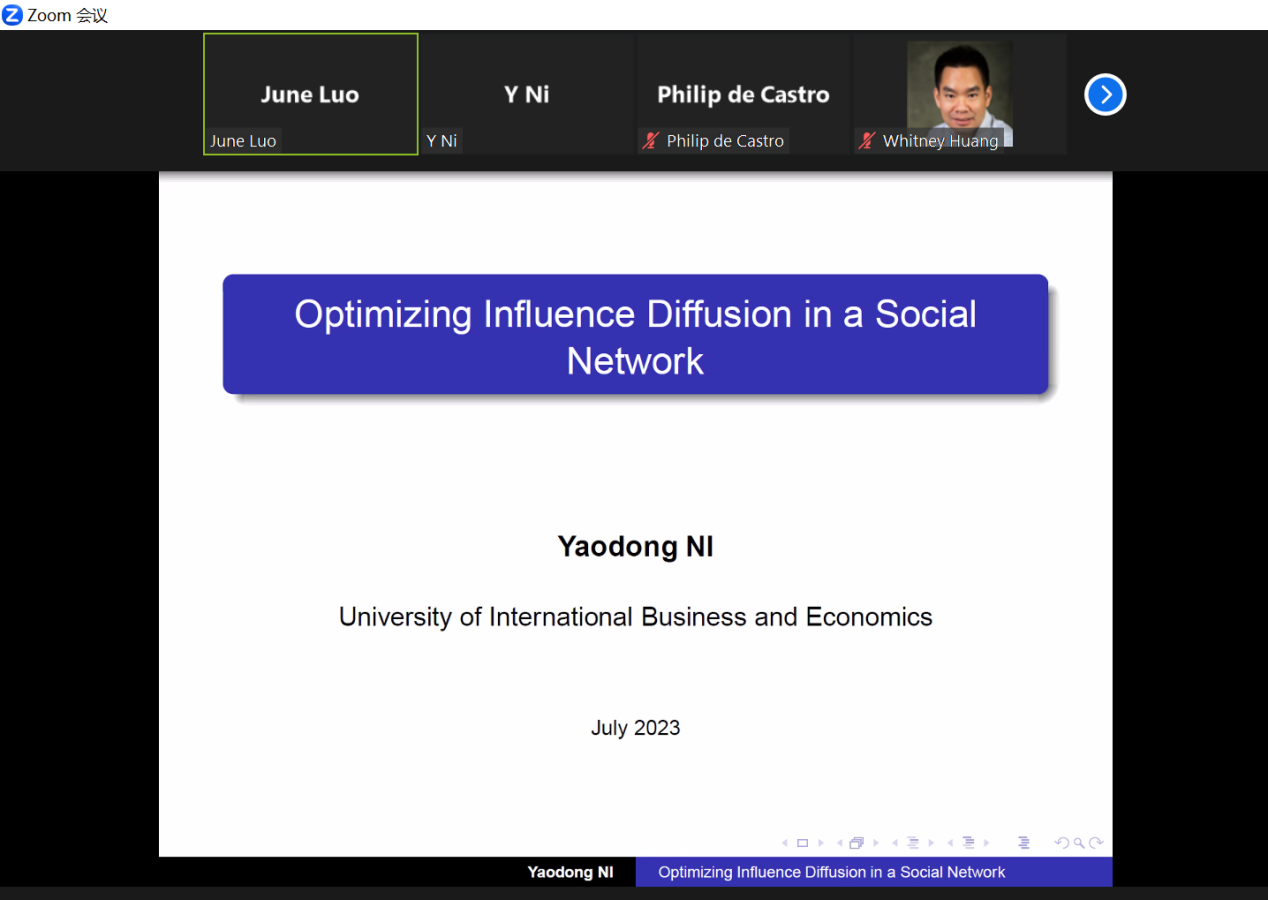 2023年11月9日,我院倪耀东教授受美国克莱姆森大学之邀,在线做了以“Optimizing Influence Diffusion in a Social Network”为主题的学术报告,参加本次学术报告的有美国克莱姆森大学数理统计系全体教师和博士研究生。