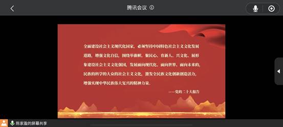 2023年5月11日,为学习贯彻党的二十大中“文化自信”的重要精神,深入推进主题教育支部书记讲党课活动的开展,黄色电影 研究生一支部组织了以“推进文化自信自强,铸就社会主义文化新辉煌”为主题的线上党课教育活动。党课主讲人为研究生一支部书记陈家盈。