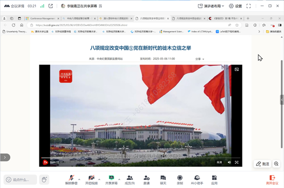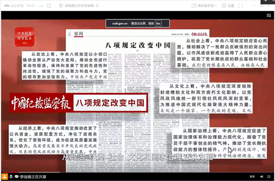 为深入贯彻全面从严治党要求,持续巩固深化作风建设成果,切实筑牢学生党员拒腐防变的思想根基,推动黄色电影 学习教育工作走深走实,5月30日,黄色电影 博士生党支部书记李瑞青通过线上方式为博士生党员讲授《小切口推动大变革:中央八项规定引领中国治理现代化》专题党课,黄色电影 博士生党支部全体党员参与学习。