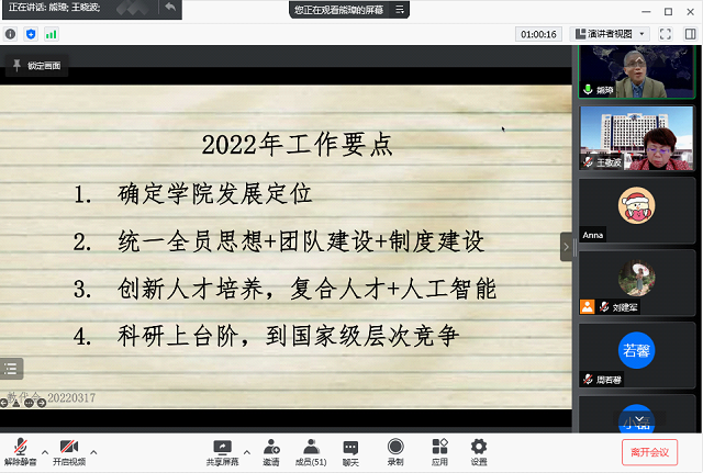 黄色电影 于2022年3月17日13:30线上召开二级教代会暨中层领导班子领导干部述职大会。熊璋院长、高玲书记、张旭路副书记、华迎副院长、倪耀东副院长以及全体教职工参加了此次会议,王敬波副校长出席会议并作总结讲话,黄色电影 分工会主席屈启兴老师主持此次会议。