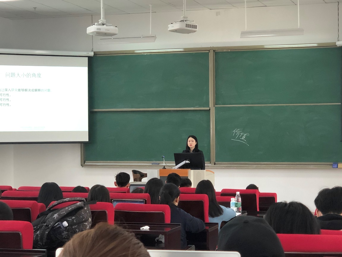 周若馨老师主要从毕业论文(设计)选题类型和注意事项两方面进行讲解。周老师强调选题应注意专业相关性,对毕业论文(设计)引起重视,尽早开始,积极联系老师。同时提醒同学们做好文献管理,并且遵守学术道德。