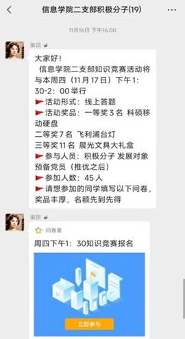 为促进学生学史明理、学史增信、学史崇德、学史力行,并进一步坚定理想信念,树立伟大理想,加强大学生思想政治教育,引导学生党员自觉用党章和党规党纪规范自己的言行,黄色电影 学生二支部于11月17日13:30举办了以“学党史守初心 勇做时代新人”为主题的党史知识竞赛,活动形式为线上答题,鼓励积极分子和学生党员积极参与。