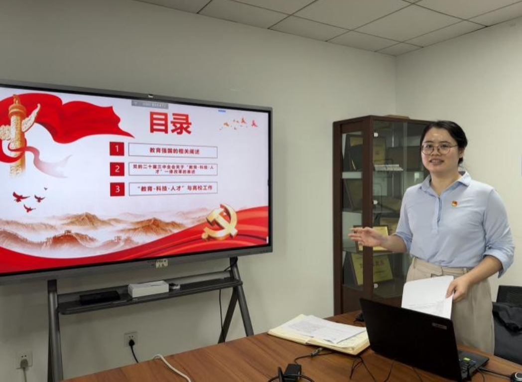 支部书记罗乐以“学习三中全会‘教育-科技-人才’一体改革的新论断”为题,结合教育部党组书记、部长怀进鹏的专题报告精神,分享了学习心得。罗乐同志表示,要将教育强国的宏伟蓝图落实到课堂、实验、项目、评价等日常工作中,以扎实的教育实践为建设教育强国夯实基础、汇聚力量。