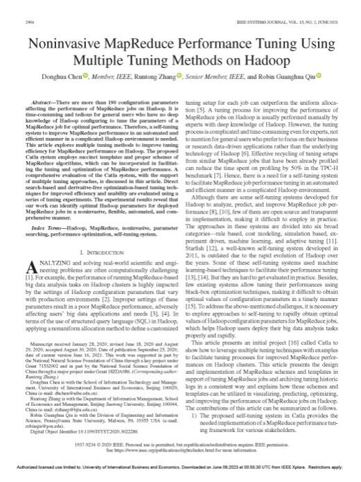 Chen D, Zhang R, Qiu R G. Noninvasive MapReduce performance tuning using multiple tuning methods on Hadoop[J]. IEEE Systems Journal, 2021, 15(2): 2906-2917.