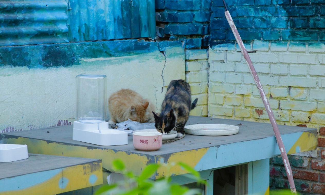 这里或许是贸大最容易和猫接触的角落,在贸大里生活的猫幸不幸福,看看每只猫有几个饭碗就知道了。(供图:王淏轩)