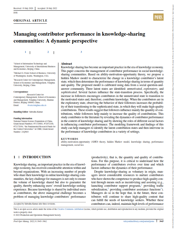 Yue Jin, Yong Tan, and Jinghua Huang. Managing Contributor Performance in Knowledge-Sharing Communities: A Dynamic Perspective, Production and Operations Management, 2022(31:11), 3945–3962. //doi.org/10.1111/poms.13822 (UTD 24, FT 50, ABS 4*, SCI, 外经贸A类国际期刊)