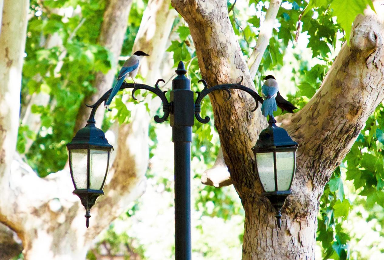 在贸大里,还生活着很多动物,它们是贸大师生的“好邻居”。惠中大道边的路灯看起来就像人的眉眼,两只喜鹊站在上面,构成了一幅喜上眉梢的景象。